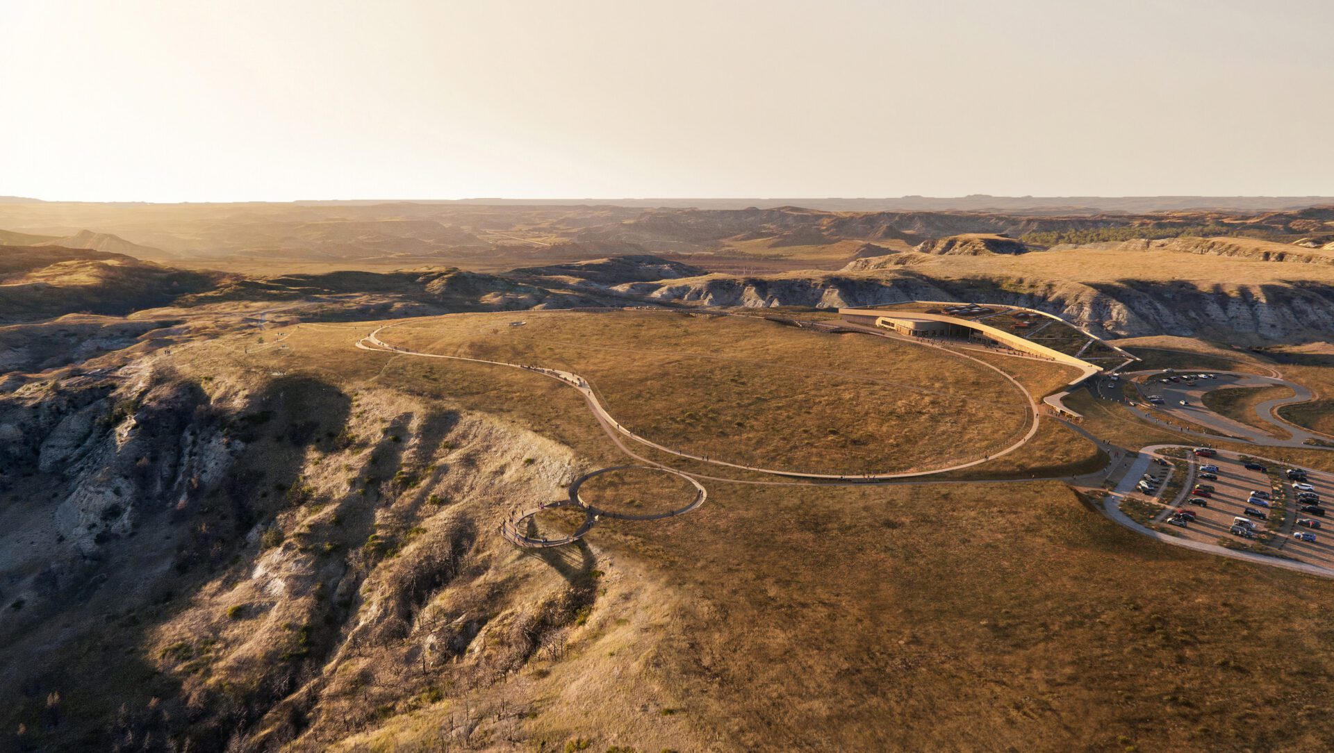The under-construction $333 million library, situated on a Badlands butte near the Burning Hills Amphitheater, will not be a repository for Roosevelt’s papers or archives (which are mostly housed at Harvard University). Instead, the library’s goal is to honor the President’s legacy as a conservationist. Its design is informed by Roosevelt’s interest in environmental stewardship and his reflections about the landscape.