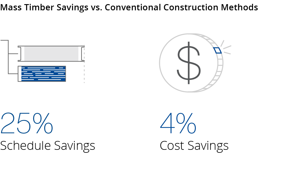 Wooden materials are renewable, they sequester carbon, and are five times lighter in weight than concrete. Projects using mass timber panel systems are completed faster and more efficiently, contributing to cost savings overall. Timber erection at Brock Commons Tallwood House, an 18-story student residence at the University of British Columbia, was completed in two and a half months—four months faster than a comparable project of pure concrete and steel1