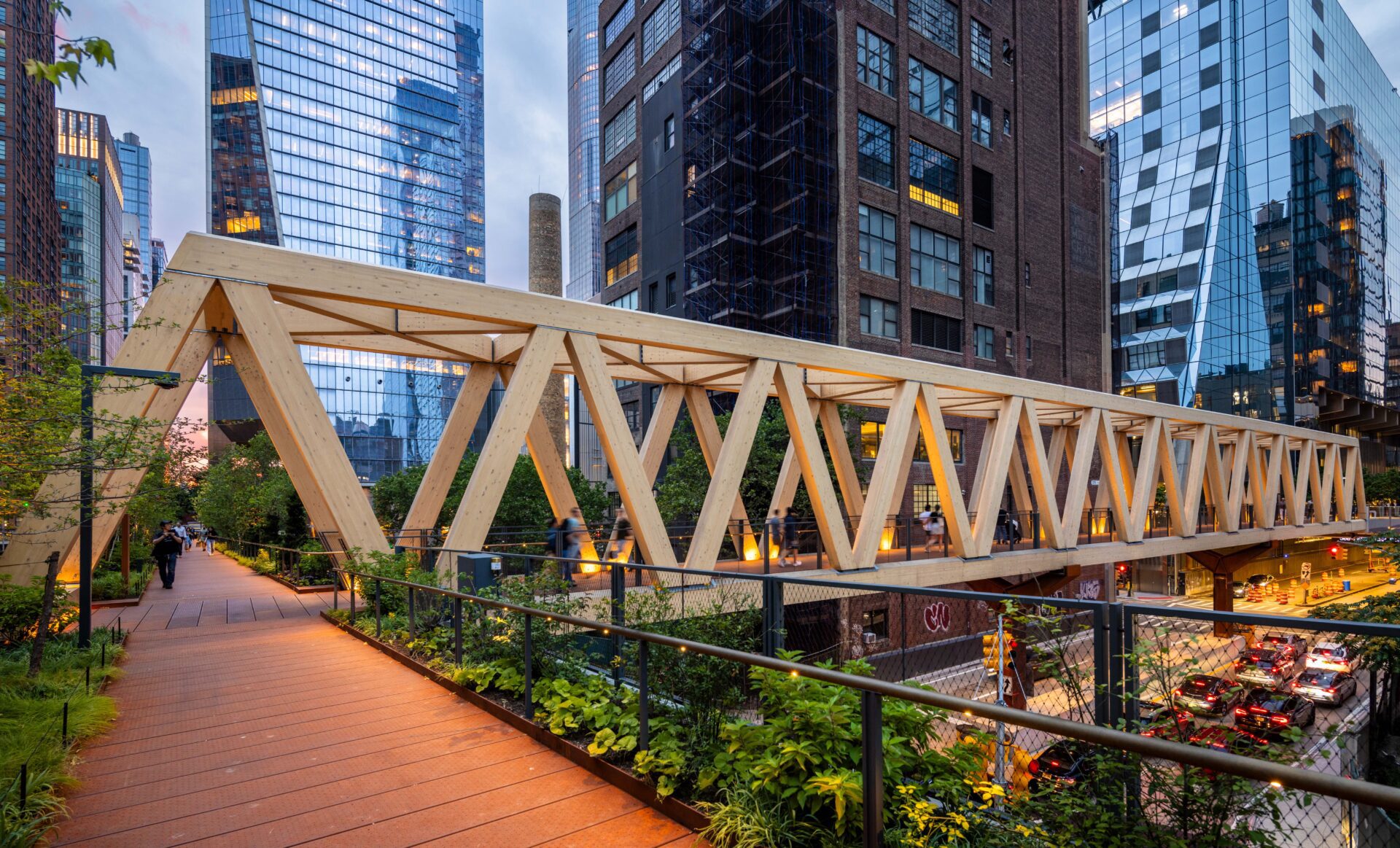 The High Line Timber Bridge is one of two pedestrian bridges that make up the Moynihan Connector and is designed to seamlessly connect public open spaces to transit within the greater bustling urban landscape of Midtown West in New York City.